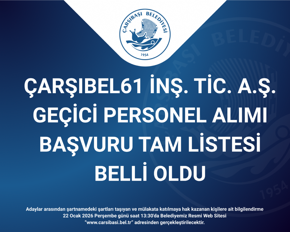 Personel Alım İlanı için toplam 21 kişi başvuru yaptı. Yapılan başvuruların değerlendirmeleri yapıldıktan sonra, kazanan adaylara ait bilgilendirme www.carsibasi.bel.tr adresinden yapılacaktır. Şartname gereği başvuruları başarılı olan kişiler; Beden İşçisi (İnşaat işleri, tamirat ve saha işleri vb.) ile ilgili mülakata 23.01.2026 çağrılacak olup, (duyurular web sitesi üzerinden yapılacak olup, herhangi bir tebligat yapılmayacaktır) başarılı olan kişiler arasından noter huzurunda kura ile 2 kişi Beden İşçisi (İnşaat işleri, tamirat ve saha işleri vb.) belirlenecektir.